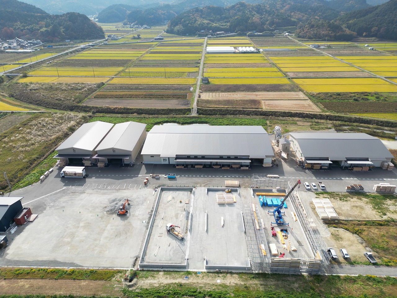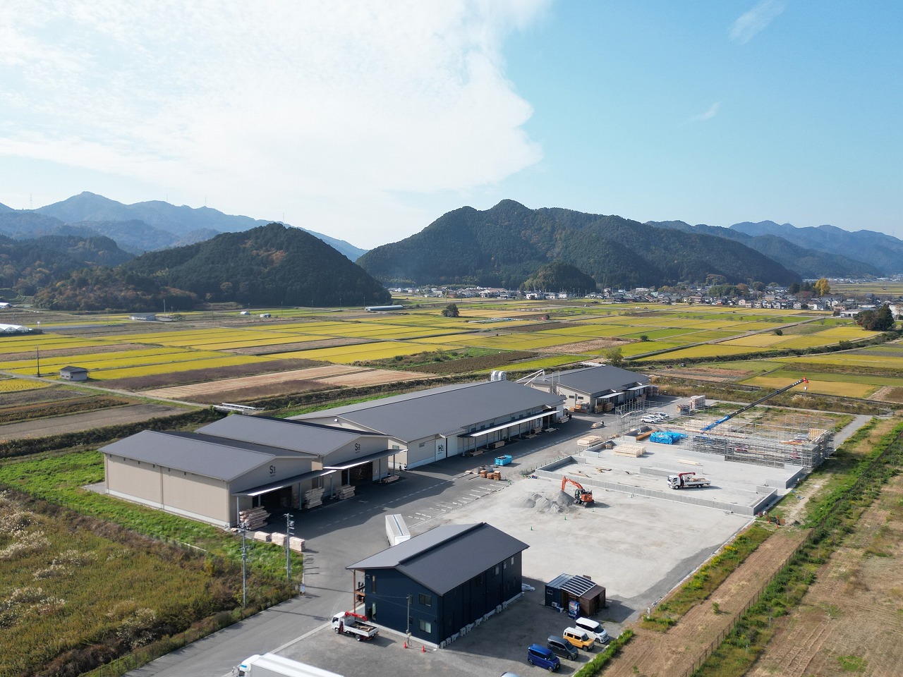 株式会社岡本銘木店の丹波篠山工場で、第3期工事の建て方が始まりました。工場・倉庫・事務所棟すべてが木造建築で、伝統と技術が息づく全景をご覧いただけます。