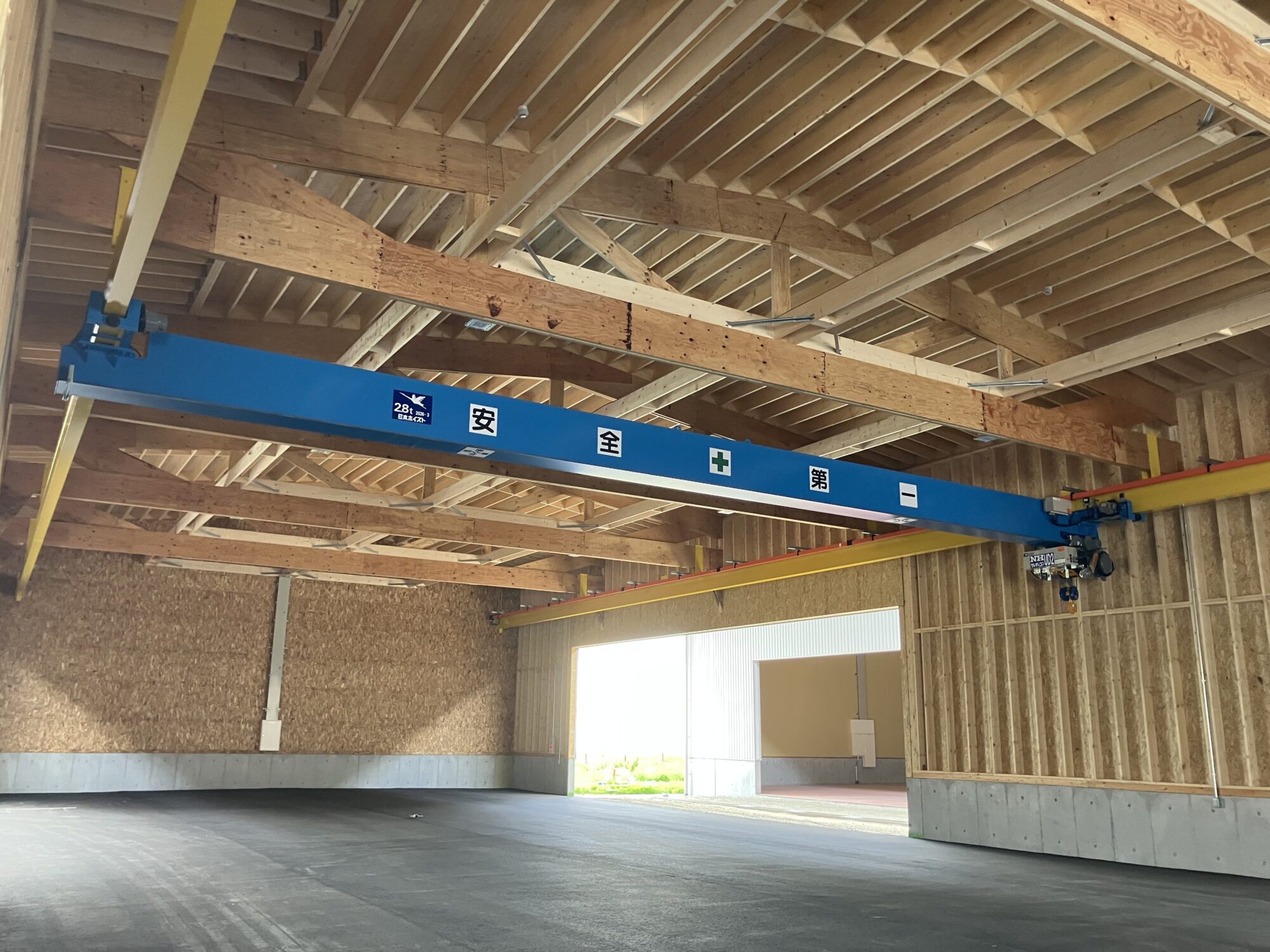 本工事では、新設する加工棟1棟および倉庫棟1棟において、各棟に2.8tホイストクレーンの設置が完了いたしました。